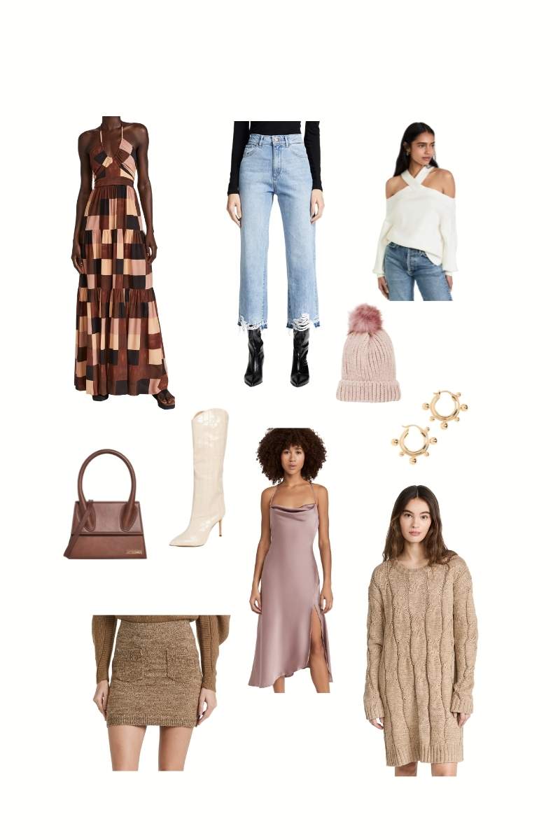 Missoma Gold Sphere Small Hoop Earrings; Jacquemus Le Grand Chiquito; DL1961 Hepburn High Rise Wide Leg Jeans; ASTR the Label Gaia Dress; 525 Cable Mini Dress; Free People Solid Viola Sweater; A.L.C. Cecilia Dress; Hat Attack Bryce Hat; Schutz Maryana Tall Boots; Line & Dot Ariana Cut Out Sweater